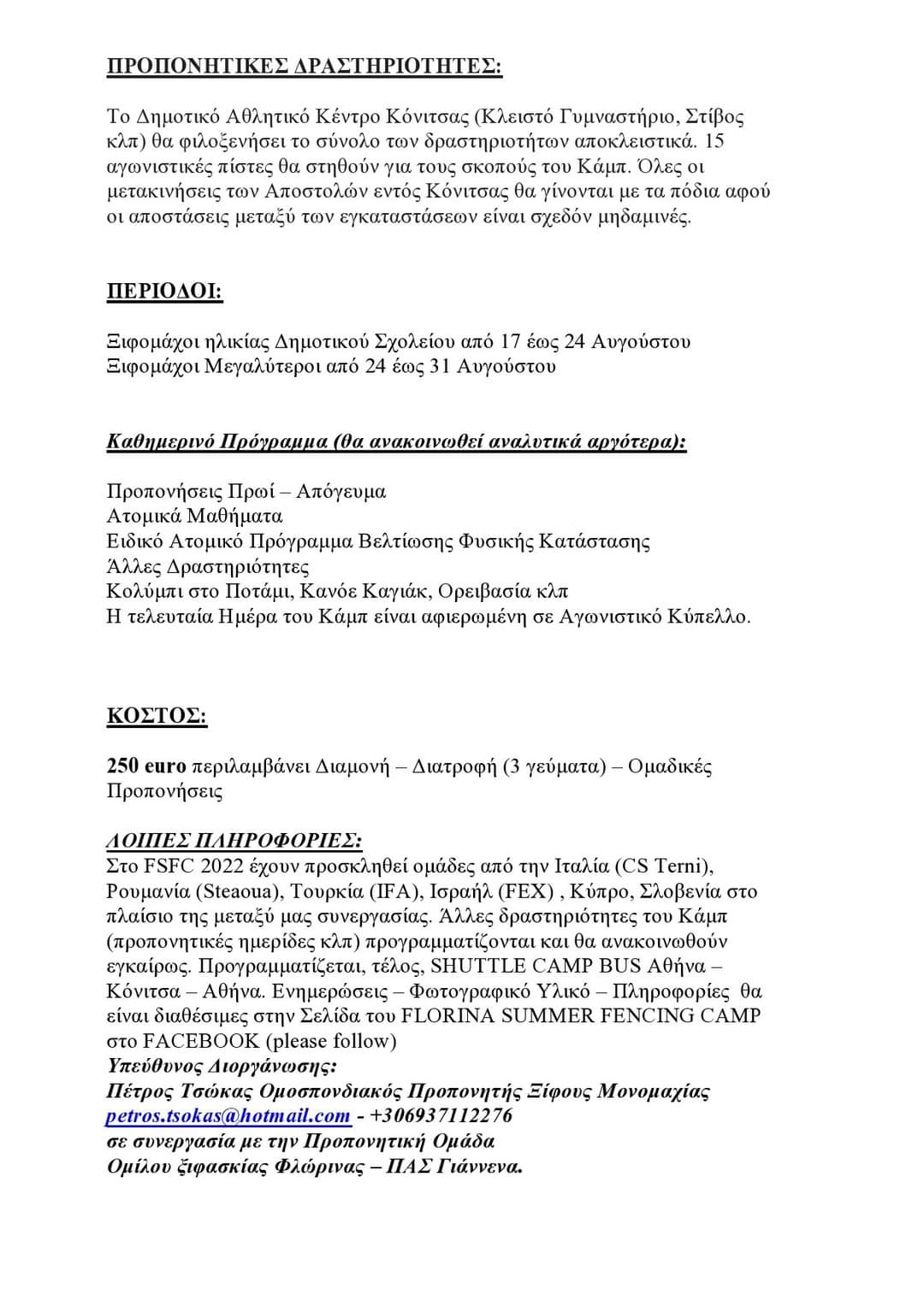 Η προπονητική ομάδα του συλλόγου μας σε συνεργασία με την προπονητική ομάδα του Ομίλου Ξιφασκίας Φλώρινας και υπό την καθοδήγηση του ομοσπονδιακού προπονητή Κ.ΤΣΩΚΑ Πέτρου θα διοργανώσουν το χρονικό διάστημα από 17 ως 31 Αυγούστου 2022 στην Κόνιτσα Ιωαννίνων προπονητικό καμπ ξιφασκίας. Με την πολύ σημαντική αρωγή του Δήμου Κόνιτσας το καμπ αναμένεται να προσελκύσει περισσότερους από 100 αθλητές από την Ελλάδα και το εξωτερικό, οι οποίοι θα πραγματοποιήσουν την προετοιμασία τους για την νέα αθλητική χρονιά στην πανέμορφη Κόνιτσα.
